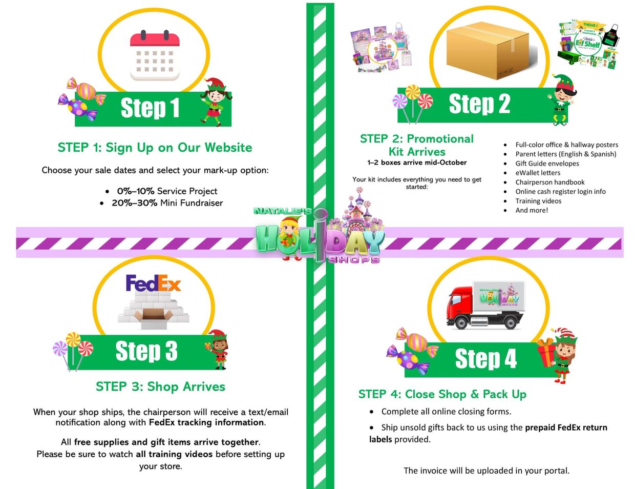 Includes Full color Office/Hallway Posters, Parent Letters (English/Spanish), Gift Guide Envelopes, eWallet letters, chairperson handbook, Online Cash Register Login Info, Training Videos and more!